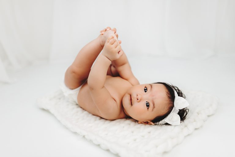 My all white sessions are shot on natural light and very minimal props. The backdrop will stay the same throughout your session and your baby can just wear a vest to showcase all their baby rolls!